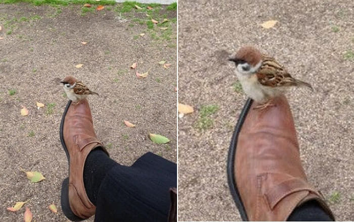 아무래도 참새가 갈색 구두를 나무로 착각한 것 같죠?