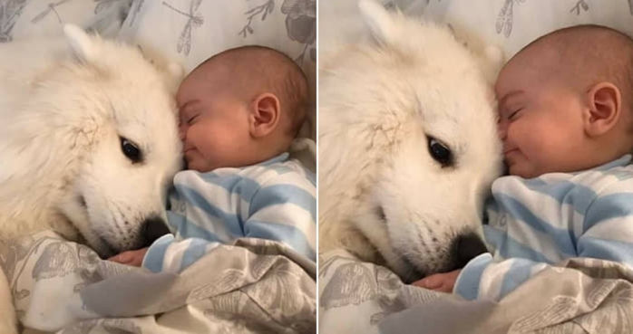 아기는 댕댕이 뽀송뽀송한 털과 온기가 좋았는지